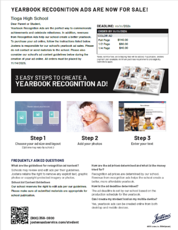 Final deadline for Senior Ads in the yearbook is January 31, 2026. Go to Jostens.com to order your ad.