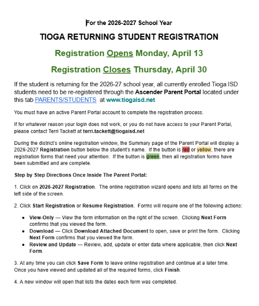 2026-27 RETURNING Student Registration will be open Apr 13th thru Apr 30th. Students returning for the 2026-27 school year need to be re-registered through the Ascender Parent Portal located under the . . .